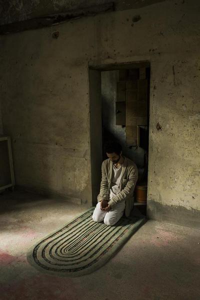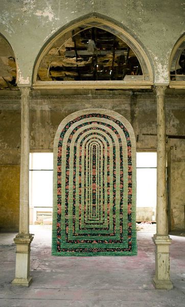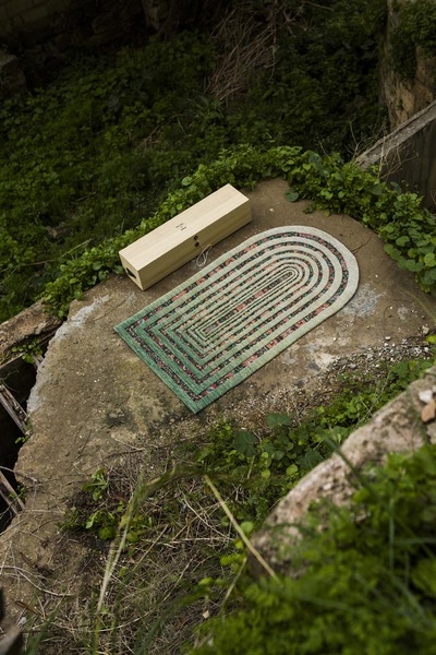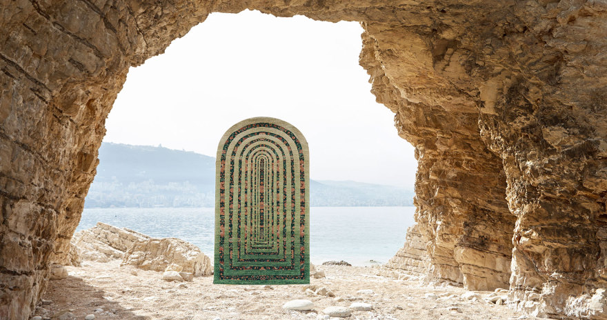"Transcendence" est une collaboration avec Zuleya by FBMI, une initiative qui soutient les tisserandes afghanes. C'est un tapis de méditation ou de prière, qui, par un jeu graphique et un effet optique de profondeur, fait référence au passage dans un monde spirituel et d'introspection.